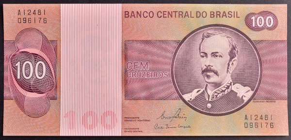 • Cédula Brasileira, Valor 100 Cruzeiros, Série A12481...A com as Assinaturas Ernane Galvêas/Carlos Langoni, Flor de Estampa.