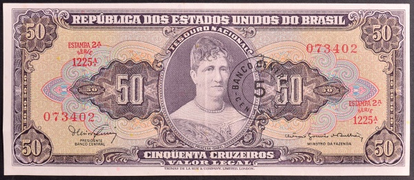 • Cédula Brasileira, Valor 50 Cruzeiros com Carimbo de 5 Centavos,  2ª Estampa, Série 1225ª, Assinaturas Dênio Nogueira/ Otávio G. de Bulhões, Flor de Estampa.