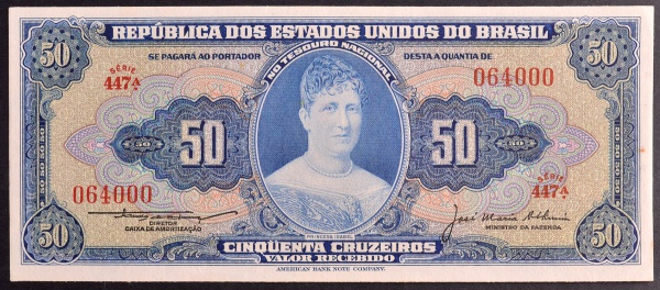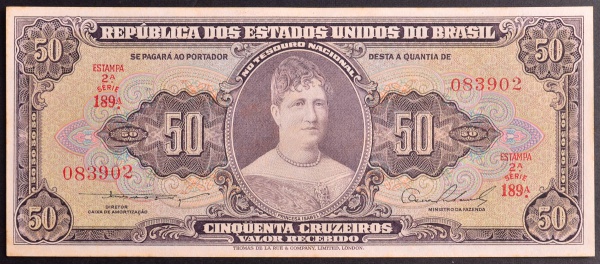 • Cédula Brasileira, Valor 50 Cruzeiros, 2ª Estampa, Série 189ª, com as Assinaturas Claudionor de Souza Lemos/Oswaldo Aranha, Flor de Estampa.
