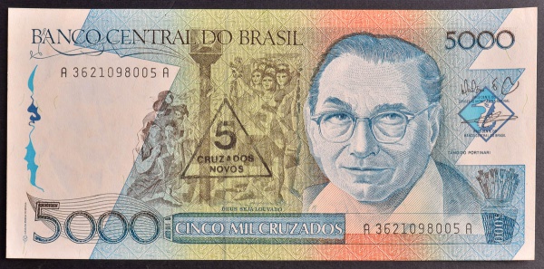 • Cédula Brasileira, Valor 5000 Cruzados com Carimbo de 5 Cruzados Novos, Série A3621...A  com as Assinaturas Maílson da Nóbrega/Wadico Bucchi, Flor de Estampa.