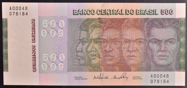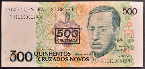 • Cédula Brasileira, Valor 500 Cruzados Novos com Carimbo de 500 Cruzeiros, Série A3111...A, com as Assinaturas Maílson da Nóbrega/Wadico Bucchi, Somente 5000 Exemplares, Flor de Estampa.