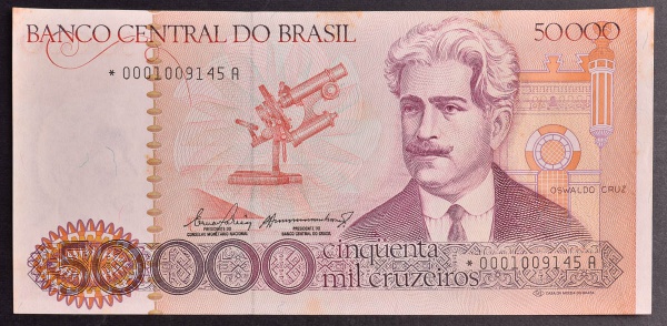 • Cédula Brasileira, "REPOSIÇÃO", Valor 50 Mil Cruzeiros, Série *0001...A, com as Assinaturas  Ernane Galvêas/Affonso Celso Pastore, Flor de Estampa.
