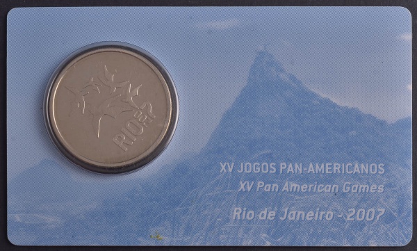 • Moeda Brasileira, Comemorativa ao XV Jogos Pan Americanos - Rio 2007, Valor 2 Reais, Ano 2007, Cupro Níquel, Cartela Original da Casa da Moeda do Brasil, Flor de Cunho
