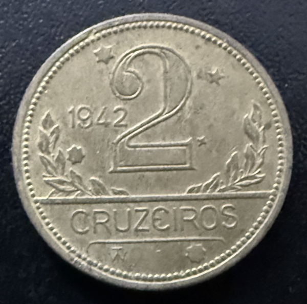 • Moeda Brasileira, Valor 2 Cruzeiros, Ano 1942, Bronze Alumínio, Soberba/Flor de Cunho.