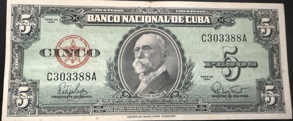 • Cédula Estrangeira, BANCO NACIONAL DE CUBA, Valor 5 Pesos, Série 1960, Muito Bem Conservada/Soberba.