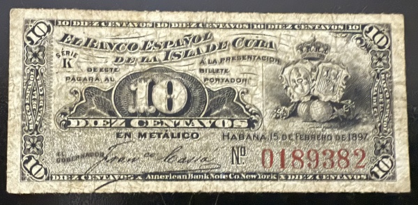 • Cédula Estrangeira, EL BANCO ESPANHOL de LA ISLA DE CUBA, Valor 10 Centavos, Data 15/02/1897, Muito Bem Conservada.
