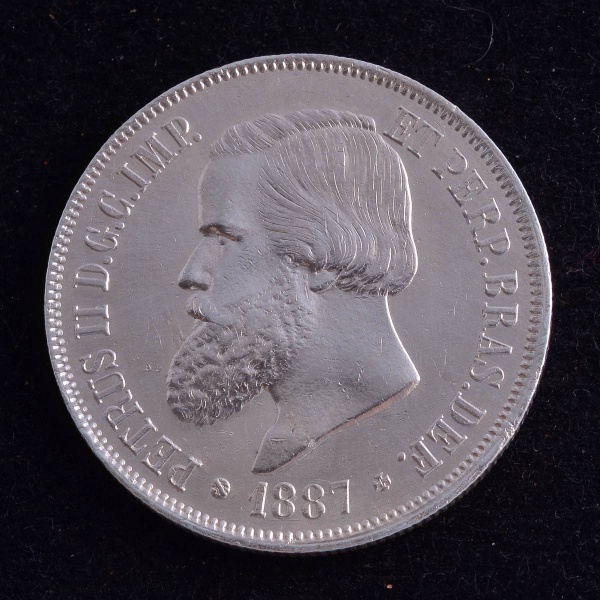 • Moeda Brasileira, Império, Valor 2000 Reis, Ano 1887, Prata, Peso 25,5 g, Soberba.