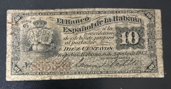 • Cédula Estrangeira, CUBA - El Banco Espanhol de la Habana, Valor 10 Centavos, Data 06/08/1883, Muito Bem Conservada.