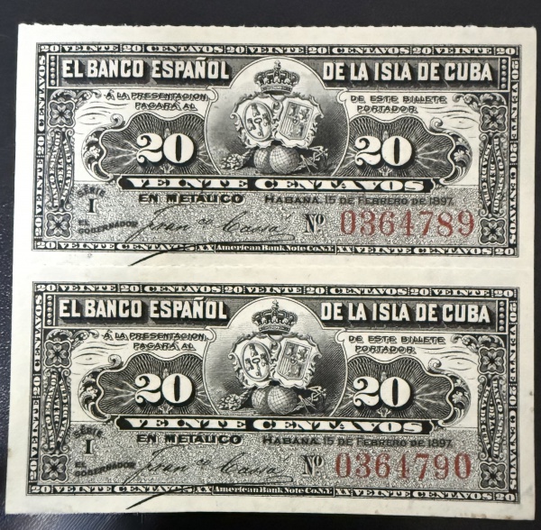• Cédulas Estrangeiras, Série Sequencial sem Corte (0364789 e 0364790), El Banco Espanhol de la Isla de CUBA, Valor 20 Centavos, Data 15/02/1897, Flor de Estampas.