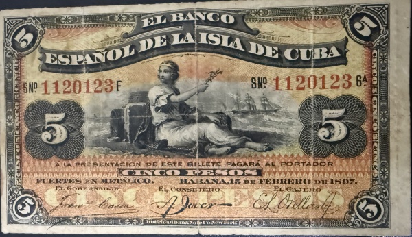 • Cédula Estrangeira, El Banco Espanhol de la Isla de CUBA, Valor 5 Pesos, Data 15/02/1897, Muito Bem Conservada.