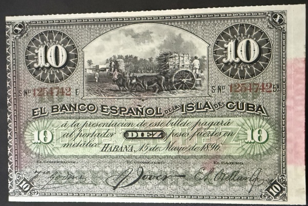 • Cédula Estrangeira, El Banco Espanhol de la Isla de CUBA, Valor 10 Pesos, Data 15/05/1896, Flor de Estampa.