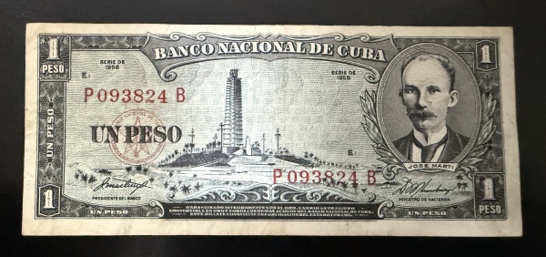 • Cédula Estrangeira, Banco Nacional de CUBA, Valor 1 Peso, Série 1958, Muito Bem Conservada.