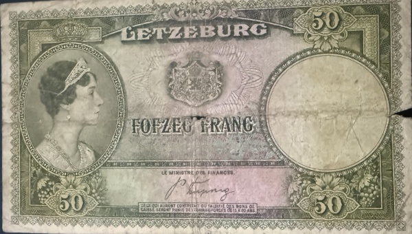• Cédula Estrangeira, LUXEMBURGO, Valor 50 Francos, Ano 1944, Muito Bem Conservada.