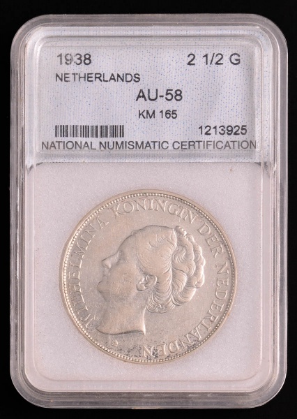 • Moeda Estrangeira, HOLANDA, Valor 2 1/2 Gulden, Ano 1938, Prata, 25 g, com Certificação AU-58 pela Empresa NNC - National Numismatic Certification.