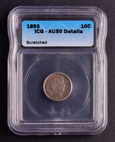 • Moeda Americana, Certificação ICG, Estado de Conservação AU-50 Detalls, Valor 10 Cents, Ano 1892, Prata,