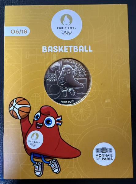 • Moeda Estrangeira, FRANÇA, Comemorativa aos Jogos Olímpicos PARIS - 2024, Mascote na Modalidade Basquetebol, Valor 10 Euros, Ano 2023, Prata, Cartela Original, Lacrada, Flor de Cunho.