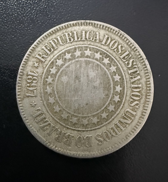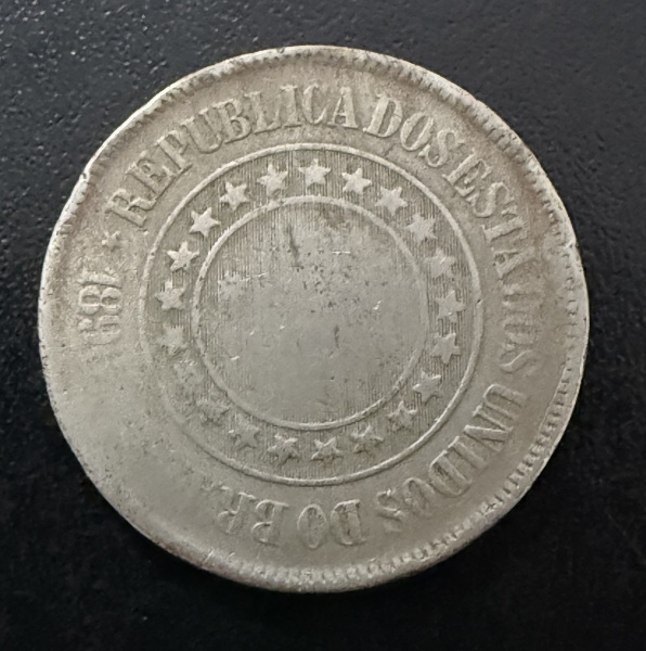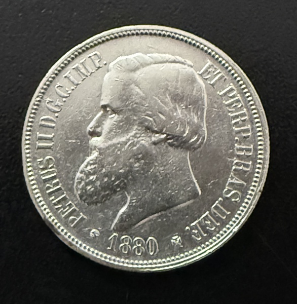 • Moeda Brasileira, Império, 4º Tipo, Valor 1000 Reis, Ano 1880, Data Emendada, Prata, Peso 12,5 g, Diâmetro 30 mm, MBC/Soberba.
