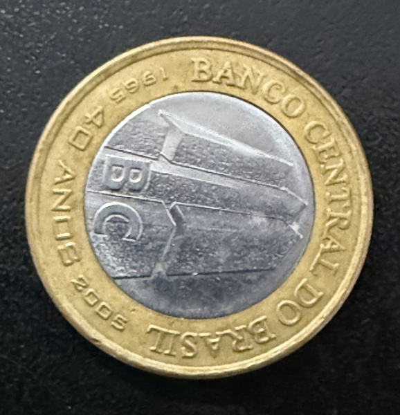 • Moeda Brasileira, "REVERSO HORIZONTAL", Valor 1 Real, Comemorativa ao 40º Aniversário do Banco Central, Ano 2005, Bimetálica, Muito Bem Conservada.