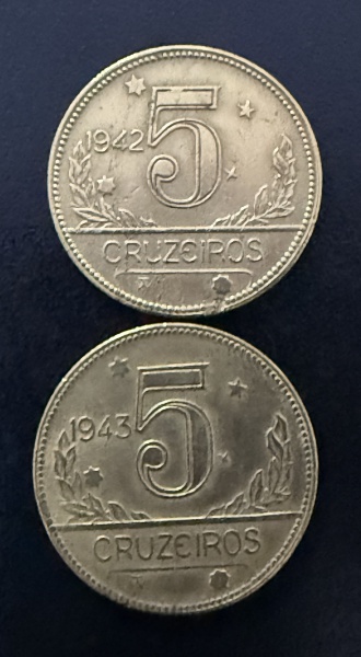 • Moedas Brasileiras, Valor 5 Cruzeiros, Datas 1942 e 1943, Bronze Alumínio, Soberbas.