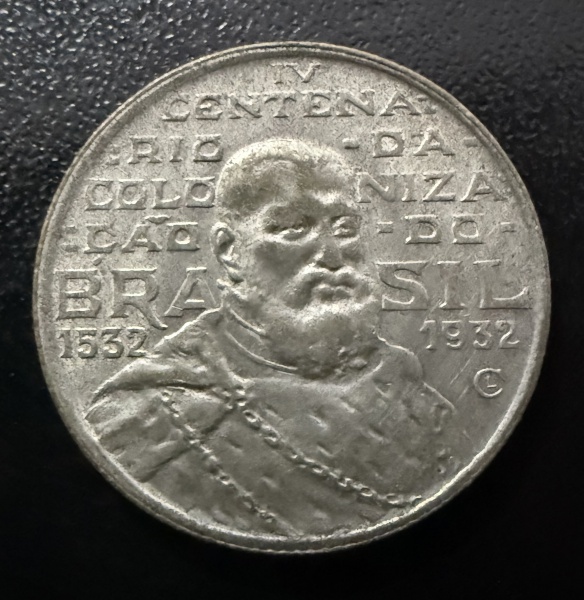 • Moeda Brasileira, Comemorativa ao 4º Centenário de São Vicente, Valor 2000 Reis, Ano 1932, Prata, Soberba.