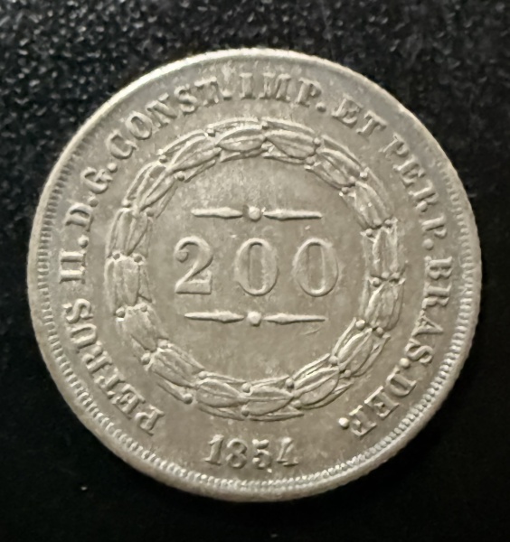 • Moeda Brasileira, Império, 2º Tipo, Valor 200 Reis, Ano 1854, Coroa com Pérolas, Prata, Peso 2,5 g, Diâmetro 19 mm, Soberba.