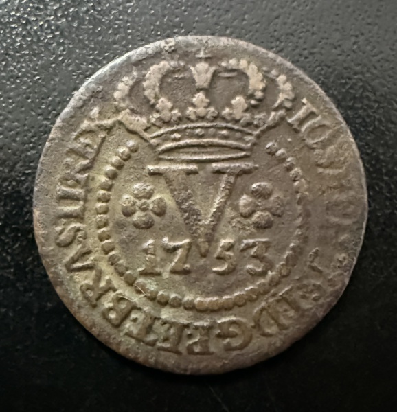 • Moeda Brasileira, Colônia, D.Iosephus I, Valor  V Reis, Ano 1753, Cobre, Muito Bem Conservada.