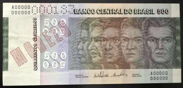 • Cédula Brasileira, "MODELO", Valor 500 Cruzeiros,  Série A00000, Ano 1972, Muito Bem Conservada/Soberba.