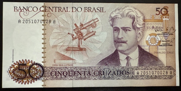 • Rara Cédula Brasileira, Valor 50 Cruzados, Ano 1986, última Série A2051 com as Chancelas Mailson F. da Nóbrega/Elmo Camões, Flor de Estampa.
