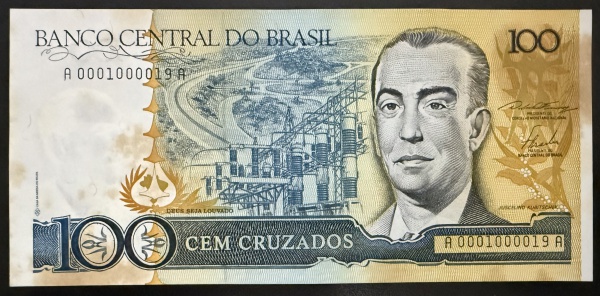 • Cédula Brasileira, Valor 100 Cruzados, Ano 1986, Primeira  Série A0001 com as Chancelas Dilson Funaro/Fernão Bracher, com Manchas - Soberba.