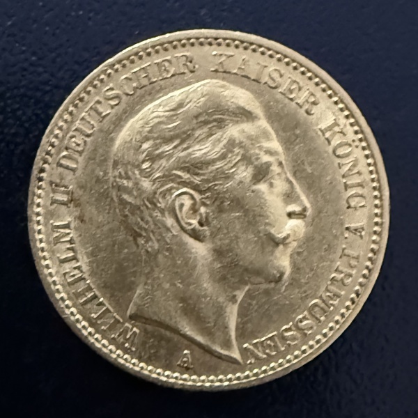 • Moeda Estrangeira, ALEMANHA - PRÚSSIA , Reinado Guilherme II, Valor 20 Mark,  Ano 1899 A, Ouro, Peso 8 g, Diâmetro 22 mm, Flor de Cunho.