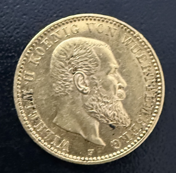 • Moeda Estrangeira, ALEMANHA - WUETTEMBERG , Reinado Guilherme II, Valor 10 Mark,  Ano 1893 F, Ouro, Peso 4 g, Diâmetro 19 mm, Flor de Cunho.