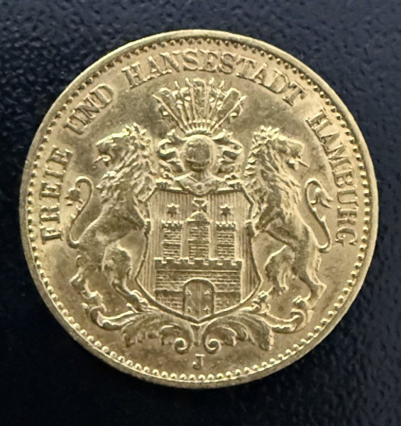 • Moeda Estrangeira, IMPÉRIO ALEMÃO - Cidade Livre e Hanseática - HAMBURGO, Primeiro Prefeito Erster Bürgermeister, Valor 10 Mark,  Ano 1903 J, Ouro, Peso 4 g, Diâmetro 19 mm, Flor de Cunho.