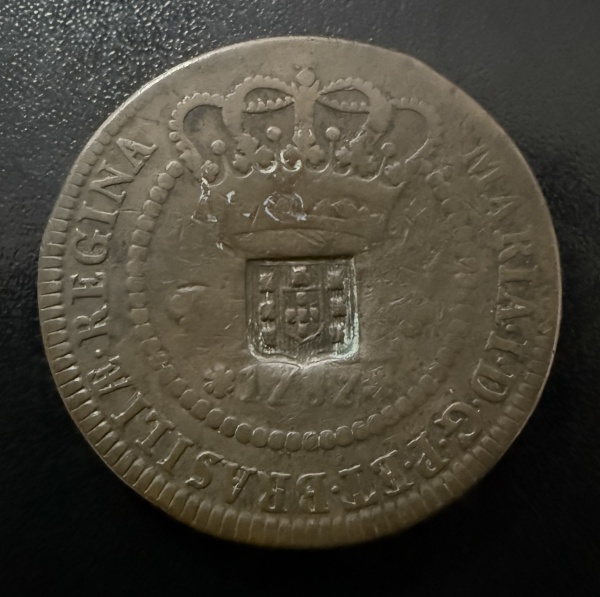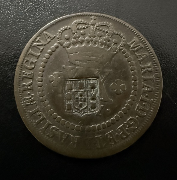 • Moeda Brasileira, Império, Valor XL Reis com Carimbo de Escudete, Ano 1787, 2º Tipo - Coroa Alta, Cobre, Soberba.