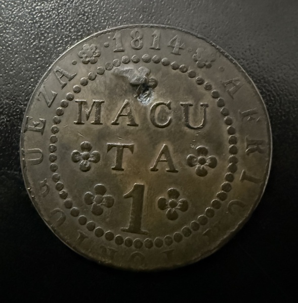 • Moeda Brasileira, Império, Valor 1 Macuta, Ano 1814, Cunhada na Casa da Moeda do Rio de Janeiro para Angola, Cobre, Furo Tampado.