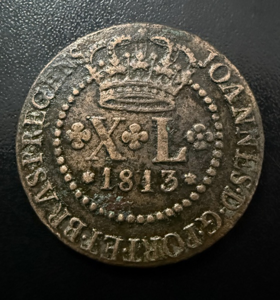 • Moeda Brasileira, Império, Valor XL Reis, Ano 1813, Casa da Moeda do Rio de Janeiro, Cobre, Muito Bem Conservada.