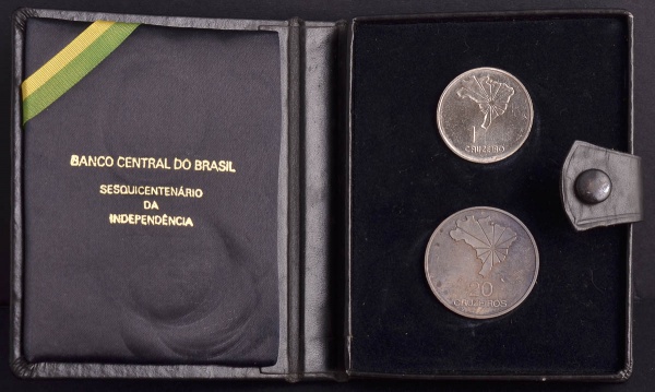 • Estojo Comemorativo ao Sesquicentenário da Independência do Brasil, Valores 1 e 20 Cruzeiros, Ano 1972, Níquel e Prata ( Peso 18 g ), Flor de Cunhos.