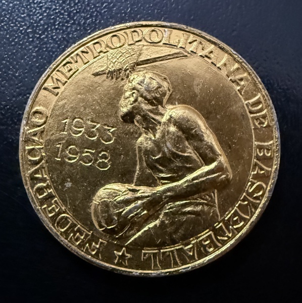 • Medalha Comemorativa, 25º Ano da Federação Metropolitana de Basquete, Data 1933/1958, Bronze, Flor de Cunho.
