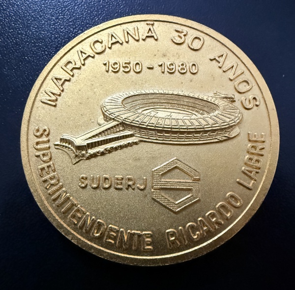 • Medalha Comemorativa, 30 Anos do Maracanã - Governo Chagas Freitas / RJ, Data 1950/1980, Bronze, Flor de Cunho.