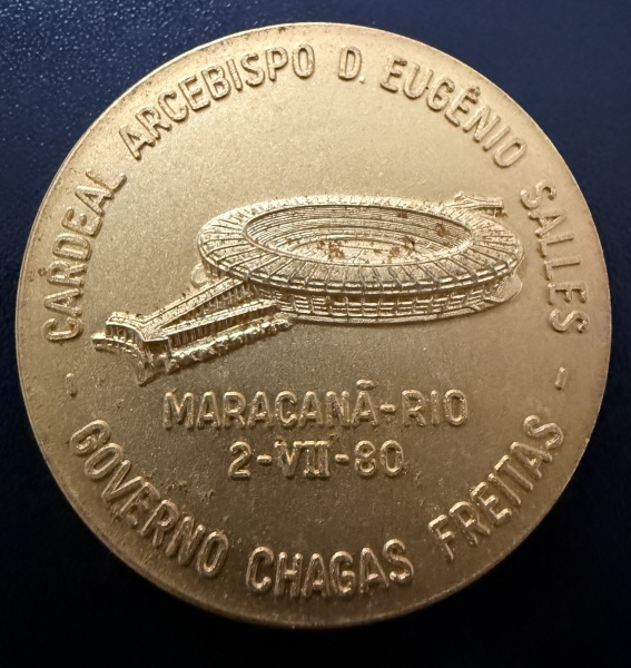 • Medalha Comemorativa, Visita do Papa João Paulo II ao Rio de Janeiro - Local Maracanã, Cardeal Arcebispo D.Eugênio Salles - Governo Chagas Freitas, Data 02/07/1980, Bronze Dourado, Muito Bem Conservada.